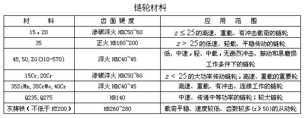 链轮的材料应能保证轮齿具有足够的耐磨性和强度。由于小链轮轮齿的啮合次数比大链轮轮齿的啮合次数多,所受冲击也较严重,故小链轮材料一般优于大链轮。